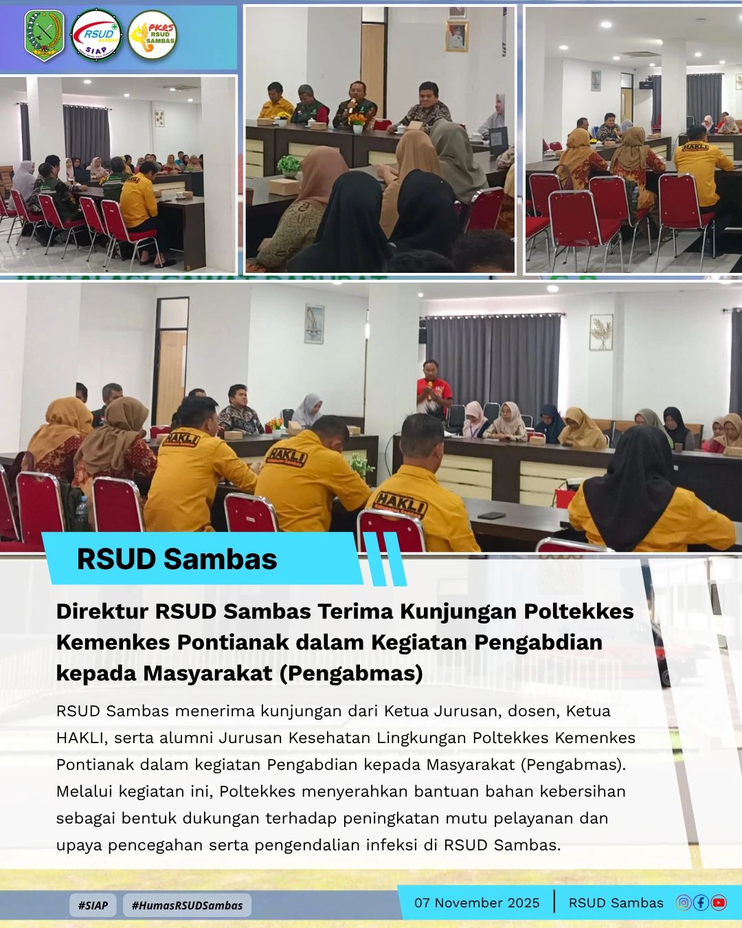 Sambas, 7 November 2025 – Direktur RSUD Sambas menerima kunjungan Ketua Jurusan, dosen, Ketua HAKLI, serta alumni mahasiswa Jurusan Kesehatan Lin...