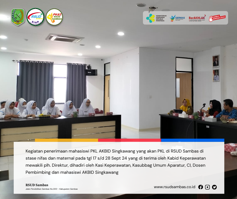 Sambas, 17 September 2024 - RSUD Sambas resmi menerima mahasiswi Praktik Kerja Lapangan (PKL) dari Akademi Kebidanan (AKBID) Singkawang yang akan...